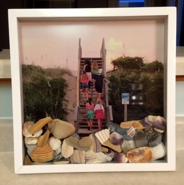 This is my latest addition. You might recognize the staircase. This picture was taken in the Outer Banks of North Carolina a few years after the one you see at the top of my website. It's my happy place. I just recently put the photo taken last summer in a shadow box with the shells we collected. I just plain love it!
