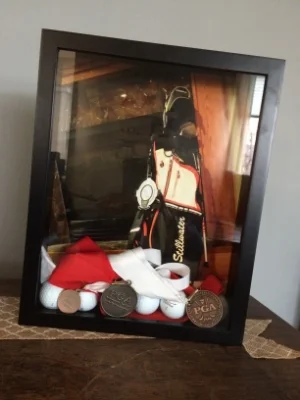 Shadowboxes are a new love of mine. This was a last minute project I threw together for my son for Valentine's Day. Again, I don't love clutter, but I do love displaying memories. This was a late night Michael's purchase and a photo (11x17 print) taken of his golf bag that same night. My son LOVES golf, so I thought it would be fun for him to have somewhere to put golf balls that are important to him (e.g. logo balls or ones from a good round). He had the idea to add the medals, which I think is awesome!