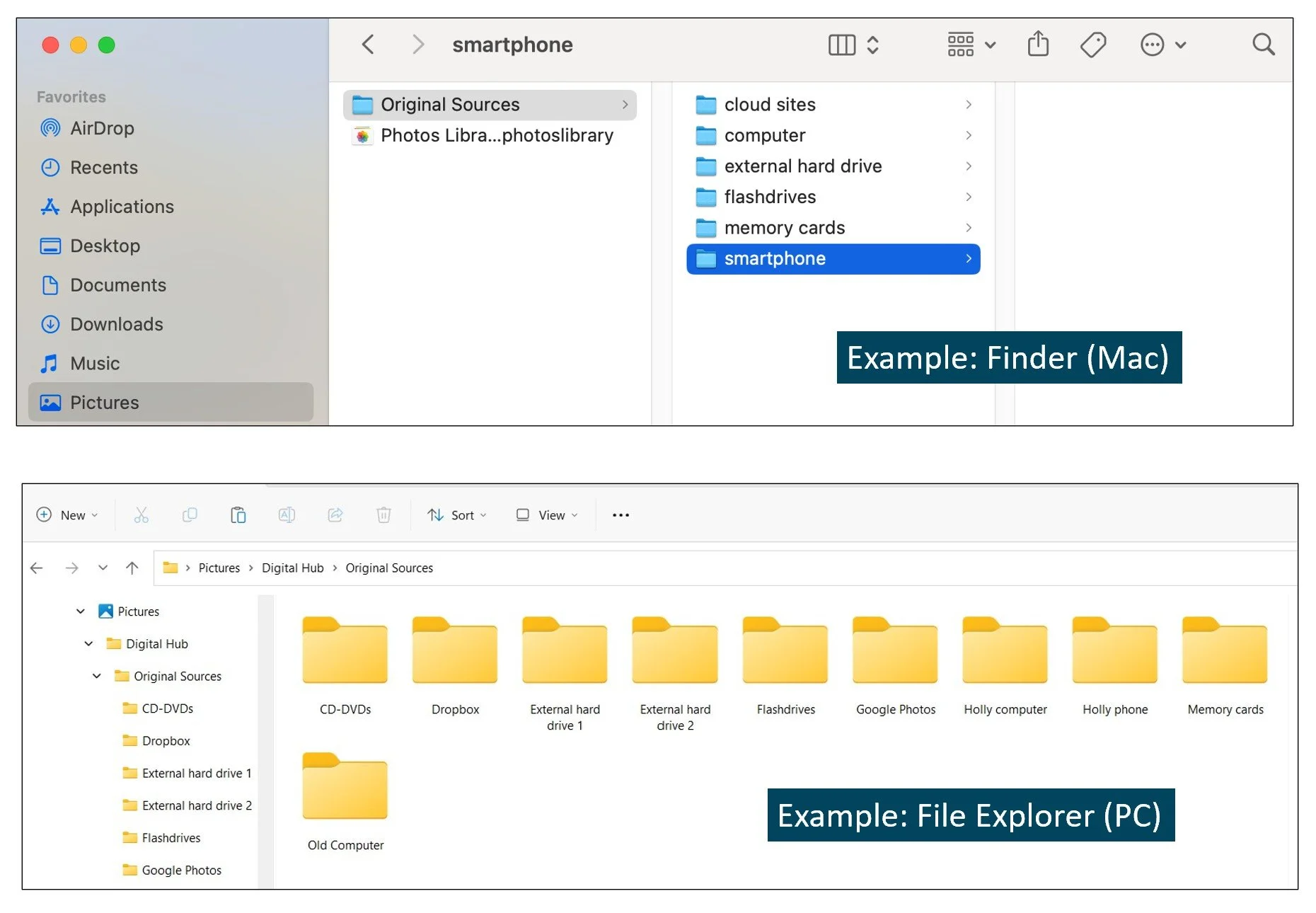 Within that folder, create subfolders for each source (e.g. computer, phone, external hard drives, memory cards, flashdrives, Cloud sites). Then, copy (don’t move, just in case something goes wrong) the photos from each of those respective sources into these folders.