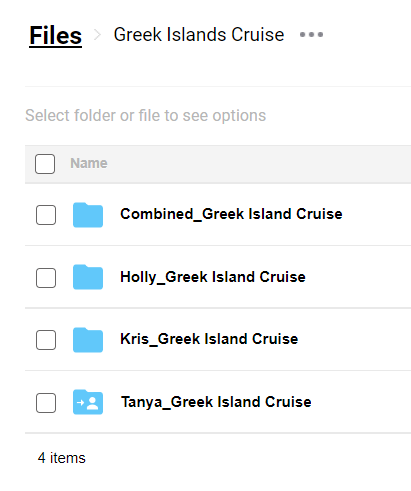 Create a folder for the vacation in the cloud site (e.g. Greek Islands Cruise), then within that, create a folder for each person’s photos (e.g. Tanya_Greek Islands Cruise), then share the link to the master folder. Emailing or texting them the link will make it easy for your traveling buddies to upload their photos in an organized fashion. Easy is good! The individual folders are helpful so you know who has uploaded their pics.
