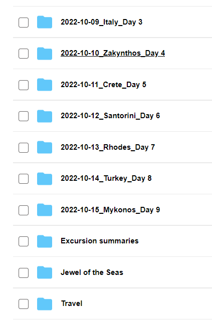 Create a folder for each day of your vacation within the “Combined” folder and/or create theme folders. For example, on a Cruise to the Greek Isles, we stopped in 8 ports on 8 different days. I created a folder for each port stop (e.g. 2022-10-12_Santorini_Day 6), but I also created 1 folder for our time spent on the boat (e.g., Jewel of the Seas) and 1 folder to capture our days of travel on the front and back end of the trip (e.g. Travel).